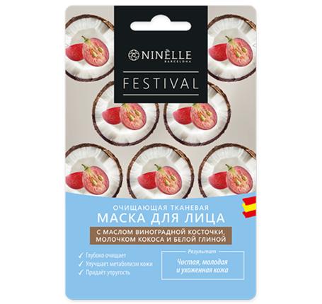 Ninelle Festival / Очищающая тканевая маска для лица с маслом виноградной косточки, молочком кокоса и белой глиной
