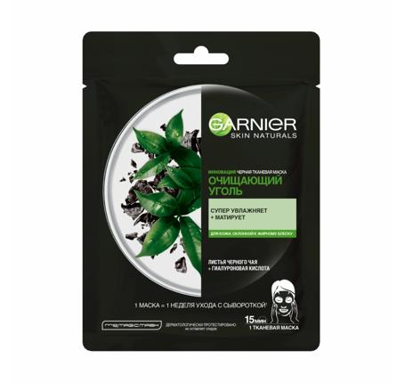 Garnier Черная Тканевая маска Очищающий Уголь+Листья Черного чая для кожи склонной к жирному блеску