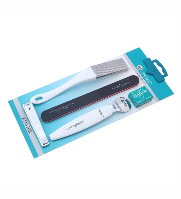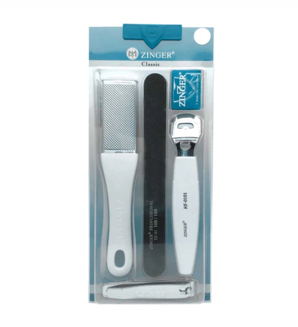 Стильный набор zinger SIS-65 для педикюра. Педикюрный набор в составе 5 предметов: Терка педикюрная двухсторонняя разной абразивности, шлифовка двухсторонняя, скребок педикюрный для ороговевшей кожи и натоптышей, набор лезвий для скребка 10 шт, книпсер для обрезания ногтей. Наиболее полная комплектация набора позволяет сделать качественный педикюр в домашних условиях.