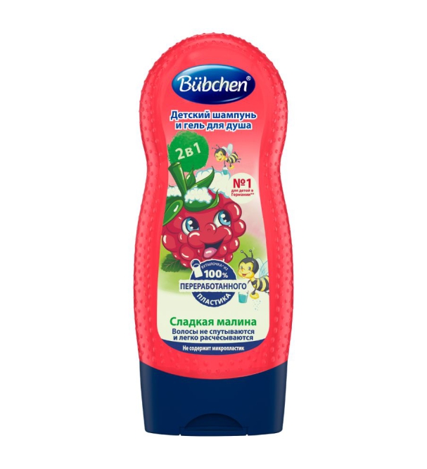 Для нежного очищения волос и кожи. С фруктовым ароматом малины, который делает мытье волос и купание настоящим удовольствием. Содержит комплекс «Бюбхен - активная защита кожи», препятствующий избыточной потере влаге через кожу. Совмещает в себе шампунь и гель для душа. Бережно очищает, ухаживает за кожей и придает волосам шелковый блеск. После мытья волосы легко расчесываются. Использовать с 3-х лет.