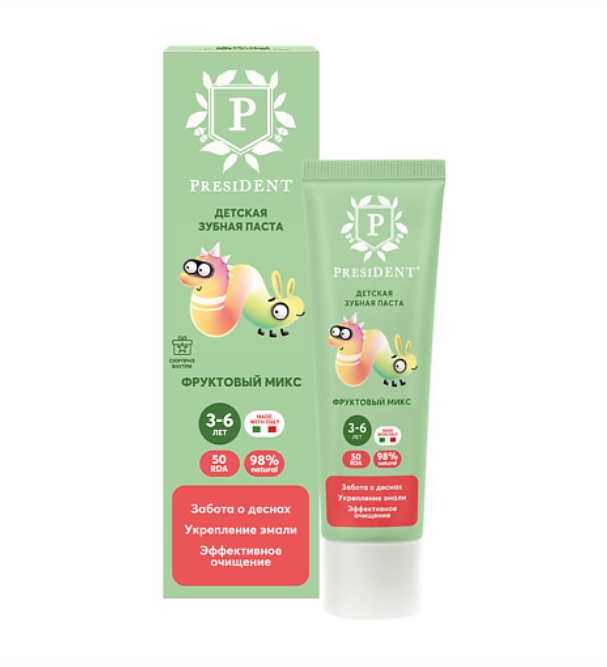 Детская зубная паста PRESIDENT® Фруктовый микс от 3 до 6 лет (43 гр.) обеспечивает заботу о деснах, укрепление эмали и эффективное очищение.