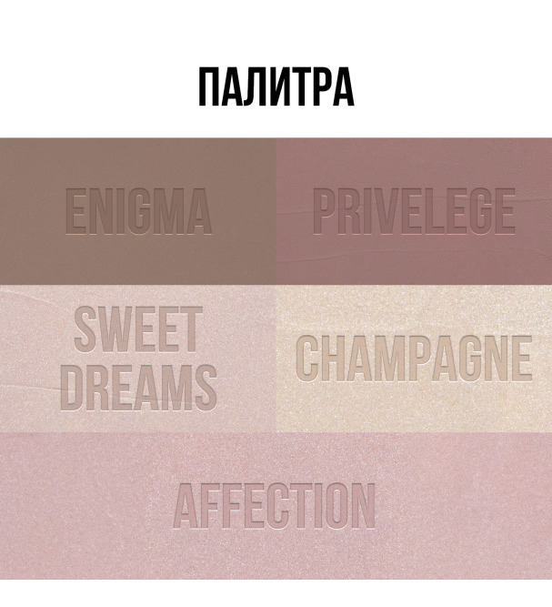 Представлены в пяти натуральных оттенках. дымчато-бежевом (01 – Enigma) и дымчато-розовом (02 – Privilege) с матовым финишем, холодно-розовом (03 – Sweet dreams), золотисто-бежевом (04 – Champagne) и золотисто-розовом (05 – Affection) с сияющим финишем.