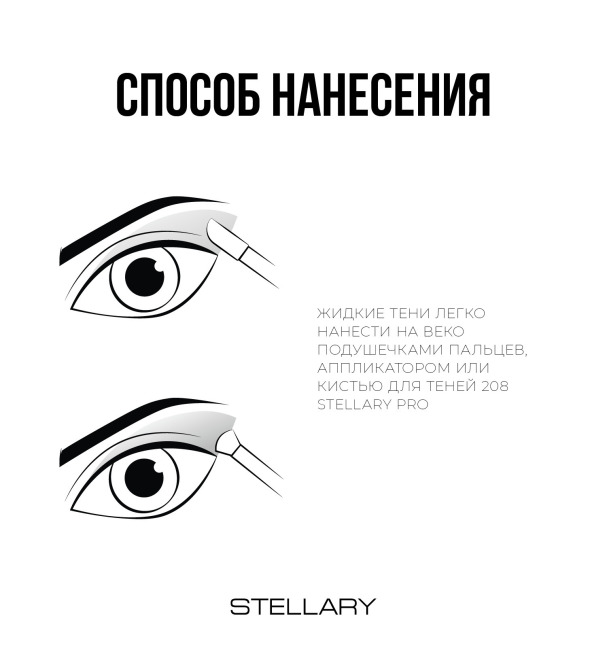 Жидкие тени легко нанести на веко подушечками пальцев, аппликатором или кистью для теней 208 STELLARY PRO.