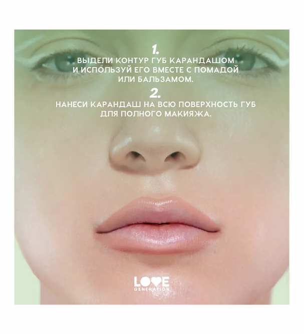 Наноси карандаш на всю поверхность губ, чтобы сделать полноценный макияж. Используй вместе с помадой или бальзамом. Чтобы сделать карандаш более острым, воспользуйся любой косметической точилкой.