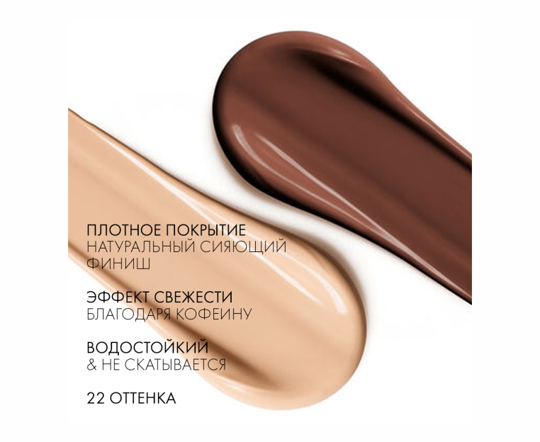 Благодаря уникальной формуле консилер легко ложится на кожу, не скатывается и обеспечивает естественный сияющий финиш и водостойкое покрытие. Благодаря кофеину в составе средство мгновенно освежает и преображает кожу в области глаз.