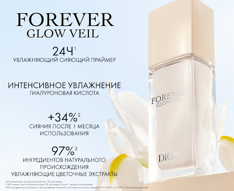 Содержащий концентрированную увлажняющую сыворотку и обогащенный гиалуроновой кислотой 100%**** натурального происхождения, праймер Dior Forever Glow Veil интенсивно увлажняет кожу и обеспечивает мгновенный эффект сияния. Кожа сияет, а ее текстура более совершенна.