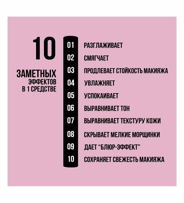 Он объединяет сразу десять бьюти-бонусов: разглаживает, смягчает, продлевает стойкость макияжа до 16 часов, увлажняет, успокаивает кожу, выравнивает тон, делает текстуру более гладкой, визуально смягчает линии, создаёт эффект soft-focus и сохраняет свежесть макияжа.
