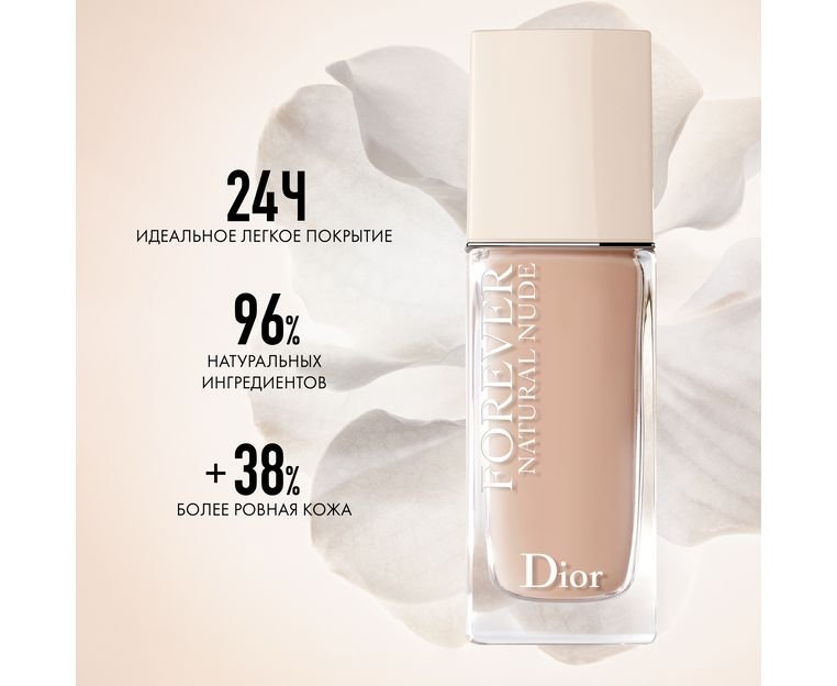 Откройте для себя натуральный финиш тонального средства Dior Forever Natural Nude: 24ч идеальное натуральное покрытие, формула состоящая из 96% натуральных ингредиентов- концентрация цветочного ухода за кожей.