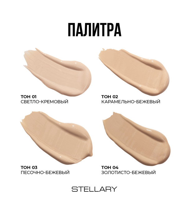 У тонального крема высокая степень покрытия. Он не создает на лице эффект маски и не оставляет липкость. Крем не только отлично выравнивает тон, но и увлажняет кожу, делает ее ухоженной благодаря пантенолу, витаминам Е и С в составе. В ассортименте Stellary тональный крем PERFECT NUDE SKIN FOUNDATION представлен в четырех оттенках: 01 — светло-кремовый, 02 — карамельно-бежевый, 03 — песочно-бежевый, 04 — золотисто-бежевый. Выбирайте тот, который подходит именно вам, и наслаждайтесь ровным и естественным тоном кожи.