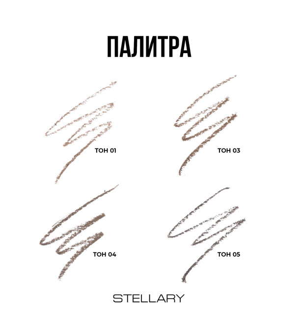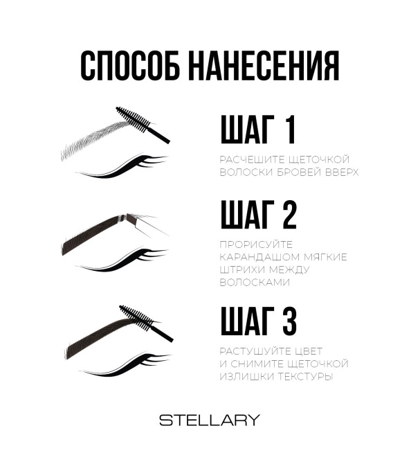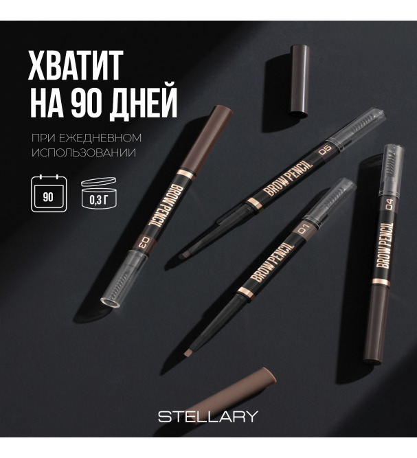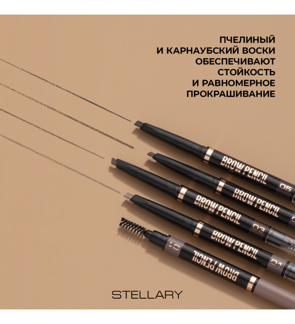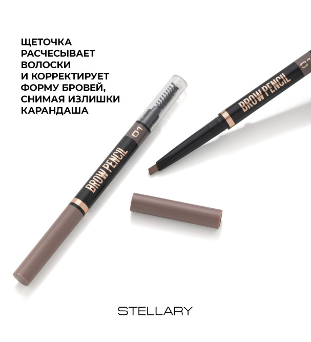 Профессиональный автоматический карандаш Stellary для идеальных бровей. Клиновидная форма грифеля обеспечивает удобство нанесения и позволяет сделать как тонкую, так и широкую линию. На обратной стороне карандаша есть густая щеточка, которая поможет смоделировать линию брови, расчесать и уложить волоски, растушевать четкий контур. Воски в составе обеспечивают стойкий результат в течение дня. Автоматический карандаш Stellary поможет вам создать идеальные брови, а также поменять их форму - сделать шире или длиннее. В ассортименте карандаши четырех натуральных оттенков.