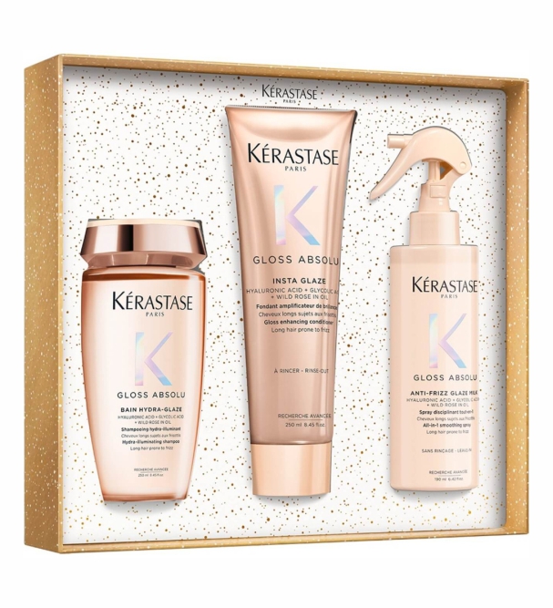 Набор Kérastase Gloss Absolu Fondant Holiday состоит из трех частей и предназначен для ухода за длинными, склонными к пушению волосами. Благодаря гиалуроновой кислоте, гликолевой кислоте и маслу дикой розы Gloss Absolu придает волосам длительный блеск, эластичность и эластичность, не утяжеляя их. Bain Hydra-Glaze очищает кожу головы и волокна волос и придает им сияющий блеск, Fondant глубоко восстанавливает слои волос.