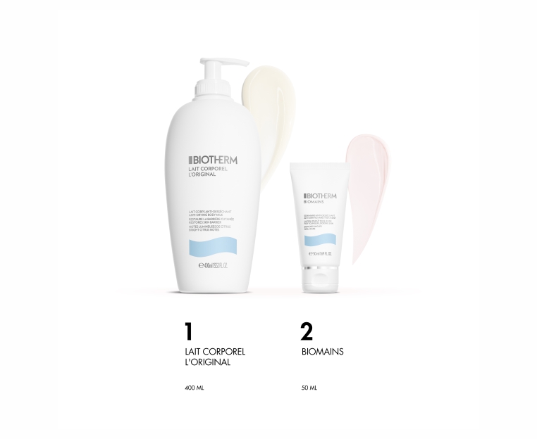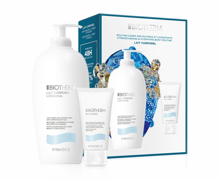 Этот набор содержит полный набор средств для ухода за телом: - Молочко для тела Lait Corporel L'Original (400 мл). Обогащенный цитрусовыми эссенциями, наш лосьон для тела восстанавливает барьер кожи и обеспечивает 48-часовую защиту от сухости. Его фирменный аромат и нелипкая текстура дарят вам поистине чувственные ощущения. Ваша кожа выглядит обновленной. - BIOMAINS (50 мл). BIOMAINS восстанавливает естественную защитную пленку кожи. Благодаря атласной вуали с экстрактами морских водорослей кожа рук остается эластичной, гладкой и мягкой в течение всего дня (водостойкая). BIOMAINS - это настоящая процедура красоты для ваших ногтей. С 1952 года BIOTHERM защищает от городского старения благодаря голубой бионауке. Эта наука происходит из океанов, над защитой которых BIOTHERM работает с 2012 года в рамках своей программы Waterlovers.