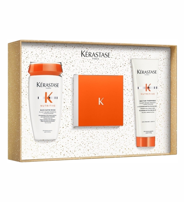 Подарочный набор Nutritive от Kerastase ограниченной серии Идеальное решение для сухих волос, обеспечивающее комплексное увлажнение с помощью питательного шампуня, кондиционера и термозащиты в рамках одной комплексной процедуры ухода. Идеальный в качестве продуманного подарка, этот набор восстанавливает шелковистую мягкость сухих волос, очищая, увлажняя и распутывая от корней до кончиков.