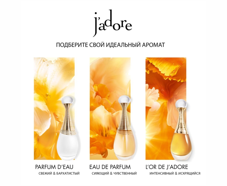 J'adore парфюмерлік суы — әйелдерге арналған таңғажайып гүлді хош иіс. Бұл хош иіс шоғыры ең соңғы бөлшегіне дейін керемет қайталанбас гүл ретінде ойлап шығарылды. Иланг-иланг эссенциясының гүлді-жемісті ноталары ашылады. Сән-салтанатты Дамаск раушаны сезімдерді оятады, ал Грас ақжұпары грандифлорум мен Самбак ақжұпарының үйлесімді дуэті де өз үлесін қосады.