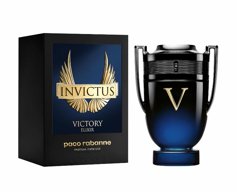Парфюм Paco Rabanne Invictus Victory Elixir представлен в градиентно окрашенном черно-синем флаконе в форме кубка с символизирующей победу золотистой буквой «V» в центре.