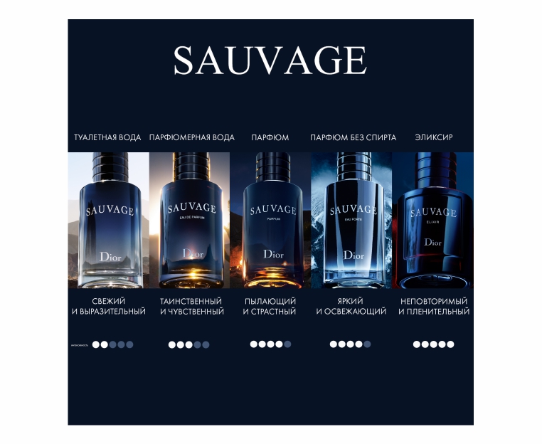 Калабриялық бергамот, жарқын нәрлі Sauvage қолтаңбасы, татымды сезімтал ноталарға бөленген. Амброксанның сүректі амбра шлейфі хош иіске ер-азаматтық қасиет беретін буалдыр ноталары бар Ваниль абсолюдің нәзік жабынына оранады.