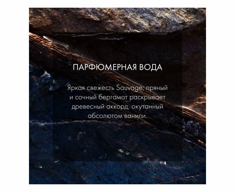 Калабрийский Бергамот, яркая сочная подпись Sauvage, окружен пикантными чувственными нотами. Древесный амбровый шлейф Амброксана кутается в нежнейшую вуаль из абсолю Ванили с дымчатыми нотами, которые делают аромат более мужественным.