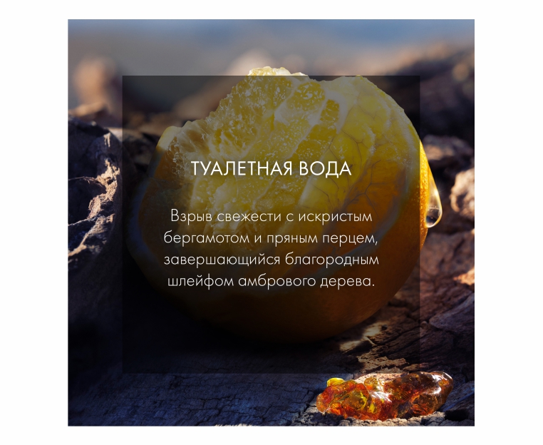 Аромат, перенасыщенный натуральными компонентами, отобранными с особой заботой, захватывает фруктовой свежестью Калабрийского Бергамота, его верхней ноты. Амброксан, полученный из драгоценной серой амбры, расстилается величественным древесным шлейфом.