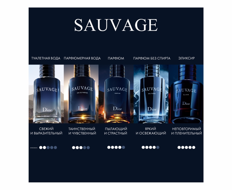 Sauvage — кең ашық кеңістіктерден шабыт алған туынды. Таулардың жартасты шыңдарынан асатын таза көк аспан. Өзіне адал ерлерге арналған батыл композиция.