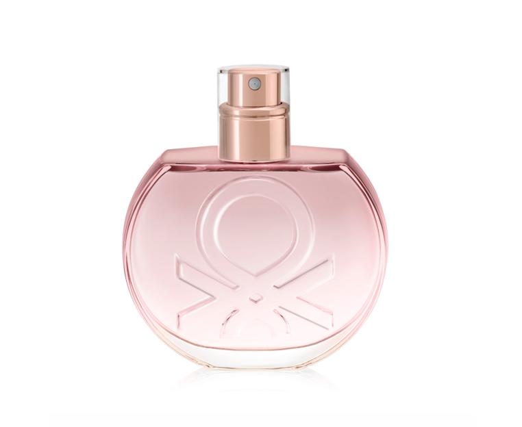 Флакон женского аромата выполнен в нежно-розовом цвете и украшен колпачков в иде культового символа Benetton.