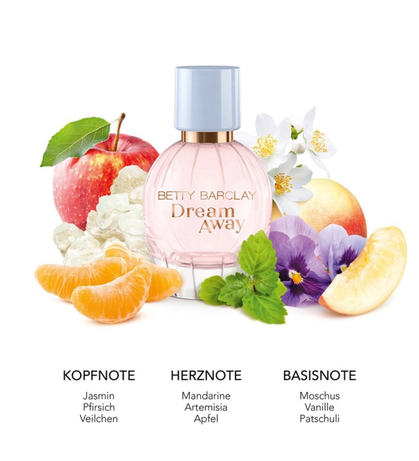 Betty Barclay Dream Away Eau De Parfum — женский цветочный фруктовый аромат 2021 года. Нежный, романтичный и воздушный, он подобен мечтам. Сладкие мечты как розовые воздушные шары, они уносят высоко-высоко, но ведь только следуя за мечтой можно открыть себя и мир вокруг. Девиз аромата: «Живите мечтой, но не откладывайте ее исполнение». День начала исполнения мечты — сегодня.