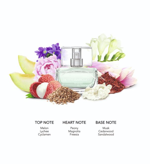 Душистый (сладкий) горошек, Дыня и Личи образуют стартовый аккорд композиции, в сердце ─ Цикламен, Фрезия, Магнолия и Пион; базу составляют Кедр, Мускус и Сандал. Betty Barclay Tender Blossom – изящный и легкий парфюм, созданный для очаровательных, нежных и романтичных женщин. Относится к семейству цветочных ароматов. Парфюм был выпущен в свет немецким дизайнерским домом Betty Barclay в 2013 году. Вдохновением для создания аромата послужили фруктовые сады и весенние цветы. Композиция аромата Betty Barclay Tender Blossom открывает свое неординарное звучание верхними аккордами личи и дыни. В сердце можно услышать ноты белой фрезии, магнолии, пиона и цикламена. Завершается композиционное звучание базовыми аккордами мускуса, белого кедра и сандалового дерева.