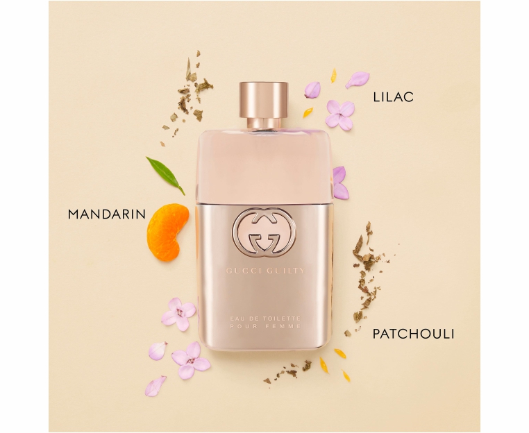 Амброво-цветочная композиция Gucci Guilty Pour Femme начинается с легких оттенков цитрусовой прохлады мандарина и игривого розового перца. Сердце аромата составлено из цветков сирени, растворяющихся во фруктовом персиково-малиновом коктейле. Эта нежность гармонично контрастирует с благоуханием египетской герани. В кремовой базе — ноты пачулей и амбры, дарящие композиции силу и чувственность.