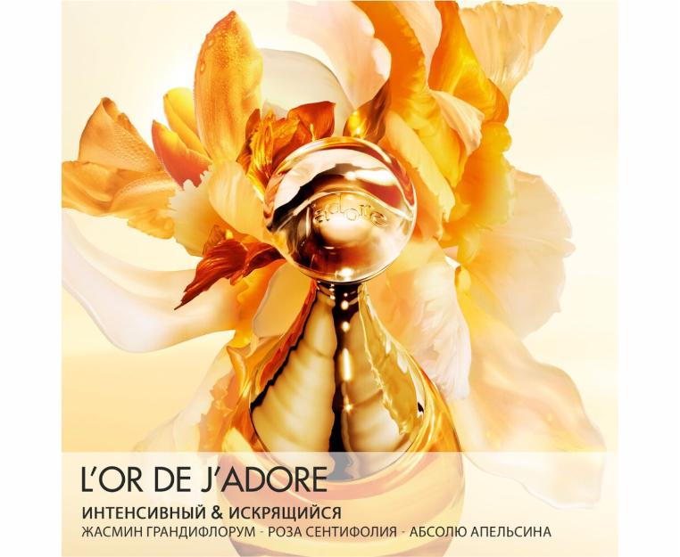 Всё золото J'Adore в чистом и неизменном концентрате. В J'Adore L'Or Франсис Куркиджян, Парфюмер Дома Dior, превозносит красоту цветов, подчеркивая их особенности. Насыщенная и чувственная парфюмерная эссенция с солнечными и интенсивным нотами, в которых сочетаются Флёрдоранж,Жасмин Грандифлорум и Роза Сентифолия.