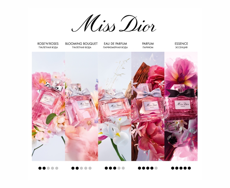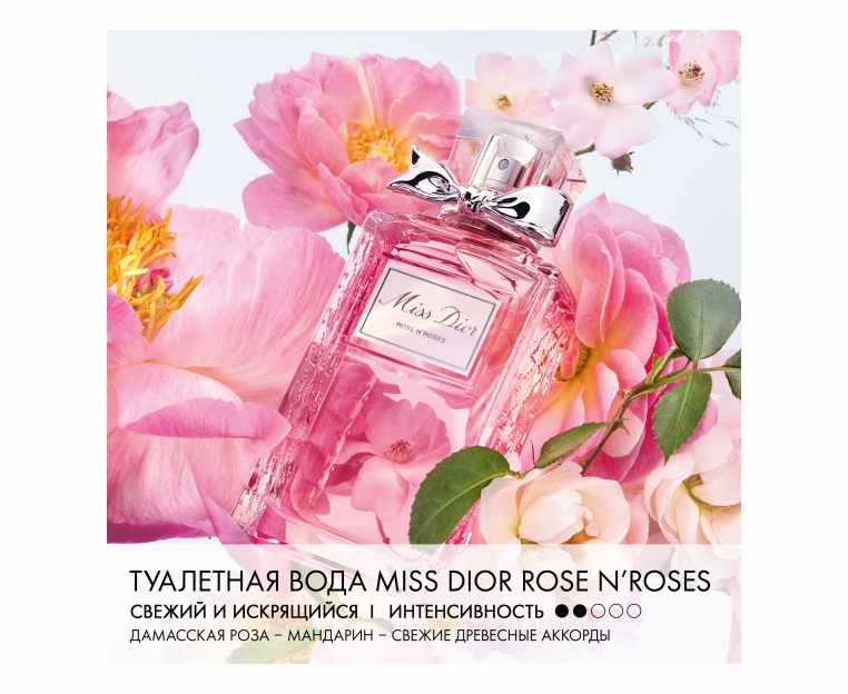Miss Dior Rose N'Roses - искрящийся цветочный аромат с богатой нотой Грасской Розы, подчеркнутой пикантным свежим аккордом Бергамота и насыщенной нотой Белого Мускуса.