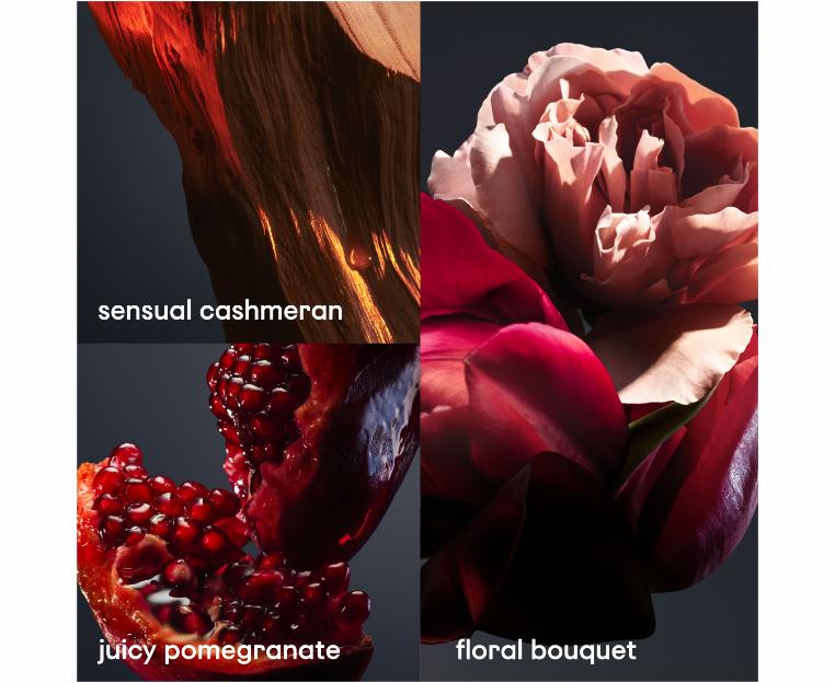 Композиция содержит восхитительные верхние ноты граната. В сердце ноты белых цветов покоряют свежестью и красотой звучания, растворяясь в тепле интенсивной и бархатистой древесины в финальном аккорде.