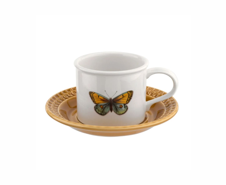 Эта чашка для завтрака Botanic Garden Harmony и блюдце от Portmeirion имеют сине-желтую бабочку на белом корпусе,