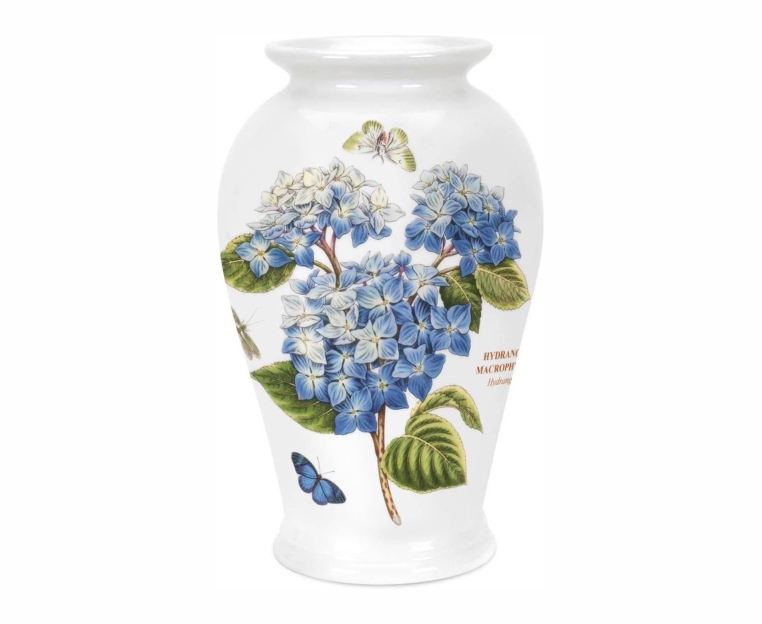 Изготовленная из фаянса, ее можно мыть вручную или в посудомоечной машине. Мотив на этой вазе — гортензия.