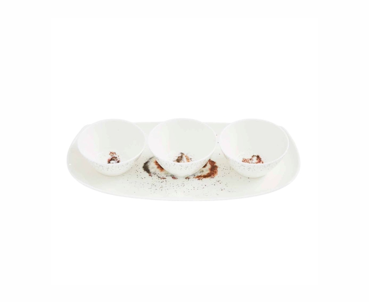 Этот керамический набор посуды с очаровательными рисунками морской свинки, мыши и кролика Wrendale от Hannah Dale — просто наслаждение. В набор входит поднос и три фарфоровые сервировочные миски, которые идеально помещаются сверху.