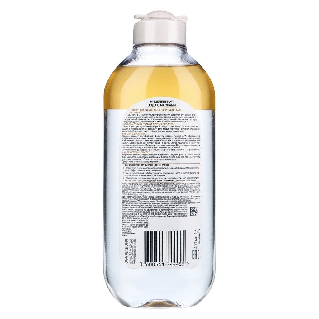 Garnier создает новое поколение двухфазных формул, обогащенных эффективными маслами, снимающими даже водостойкий макияж, и мицеллами - активными очищающими частицами, которые притягивают загрязнения как магнит, удерживают их внутри себя, а затем легко удаляются с кожи при помощи ватного диска. Встряхнув флакон один раз, Вы активируете формулу для снятия всех видов макияжа, а также устранения избытка кожного жира и загрязнений. Результат: мягкая, идеально чистая кожа без следов макияжа и жирной пленки.