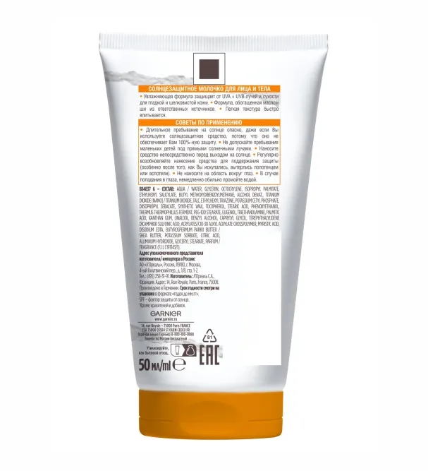 Garnier Солнцезащитное молочко для лица и тела Ambre Solaire SPF 30 содержит увлажняющую формулу, которая защищает от UVA + UVB-лучей и сухости для гладкой и шелковистой кожи. Формула, обогащенная маслом ши из ответственных источников. Легкая текстура быстро впитывается. Нежирное. Водостойкое. Способ применения: