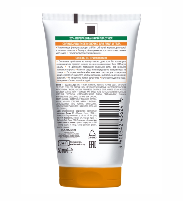 Garnier Солнцезащитное молочко для лица и тела Ambre Solaire SPF 50+ содержит увлажняющую формулу, которая защищает от UVA + UVB-лучей и сухости для гладкой и шелковистой кожи. Формула, обогащенная маслом ши из ответственных источников. Легкая текстура быстро впитывается. Нежирное. Водостойкое. Способ применения:
