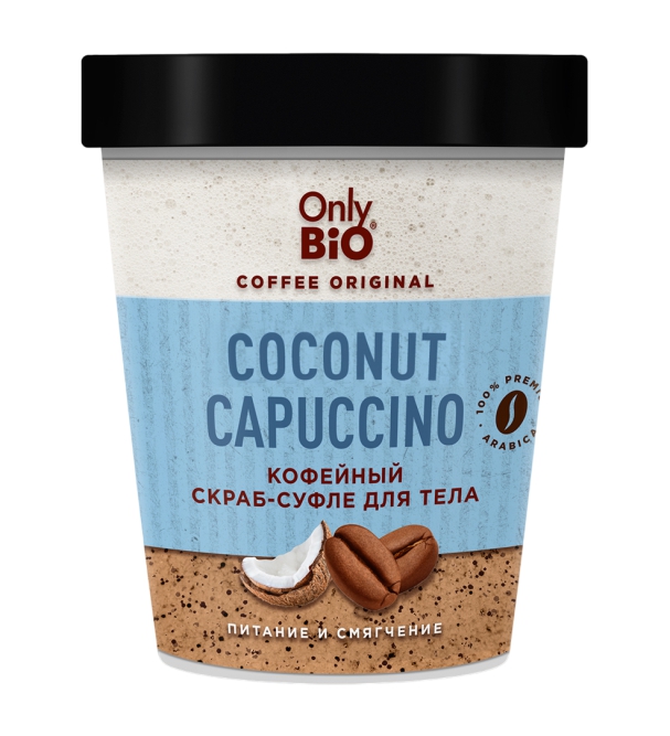 Only Bio Скраб-суфле для тела Кофейный COCONUT CAPPUCCINO Кофейный скраб-суфле – это настоящий капучино с воздушной пенкой, который будет ласкать вашу кожу. Скраб из молотых зерен арабики светлой обжарки, выращенных в горах экологически чистого региона Серрадо-ди-Минас (Бразилия), бережно очистит кожу и повысит ее тонус, даря ей в гладкость благодаря кофеину и тростниковому сахару. Способ применения: