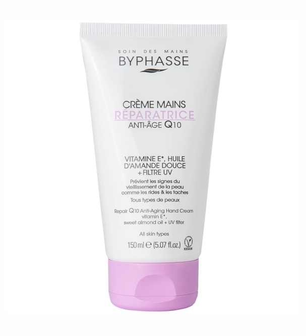 Byphasse Anti-Aging Hand Cream Q10 — это антивозрастной, питательный и увлажняющий крем для рук, который продлевает молодость кожи рук. Активно борется с признаками старения: морщинами и пигментными пятнами. Благодаря комплексу Q10, витамина Е и УФ-фильтру крем увлажняет кожу рук, смягчает и глубоко ее питает, способствует интенсивной регенерации клеток. Крем обладает приятным нежным ароматом.