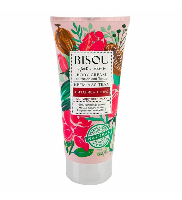 Bisou Крем для тела "Питание и тонус. Легкий высококонцентрированный крем питает, тонизирует, омолаживает и придает шелковистость кожи. Гидролат бархатной розы питает кожу витаминами. Масло какао смягчает кожный покров, тонизирует его, возобновляя его природную эластичность. Масло ши интенсивно питает. Масло семян винограда и аллантоин обладают антиоксидантным действием, омолаживают. Экстракт женьшеня стимулирует кровообращение, уменьшает отечность. Витамин Е восстанавливает эластичность и препятствует увяданию кожи. Легкий цветочно-ягодный аромат с теплой нотой какао, подарит самые незабываемые ощущения.