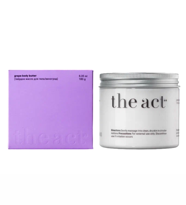 Твёрдое масло для тела с виноградом от The Act — это насыщенный органический баттер, обеспечивающий интенсивный уход за кожей тела. Его тающая текстура и уникальная питательная формула способствуют глубокому увлажнению, восстановлению и приданию коже мягкости и естественного сияния. Способ применения:
