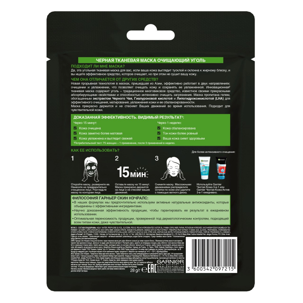 Маска для лица Garnier Черная Тканевая маска Очищающий Уголь+Листья Черного чая для кожи склонной к жирному блеску
