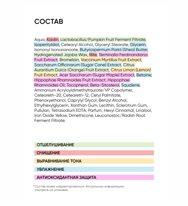 Aqua, Kaolin, Lactobacillus/Pumpkin Fruit Ferment Filtrate, Isopentyldiol, Cetearyl Alcohol, Glyceryl Stearate, Glycerin, Isononyl Isononanoate, Butyrospermum Parkii (Shea) Butter, Hydrogenated Jojoba Wax, Illite, Terminalia Ferdinandiana Fruit Extract, Bromelain, Vaccinium Myrtillus Fruit Extract, Saccharum Officinarum (Sugar Cane) Extract, Citrus Aurantium Dulcis (Orange) Fruit Extract, Citrus Limon (Lemon) Fruit Extract, Acer Saccharum (Sugar Maple) Extract, Betaine, Hippophae Rhamnoides Fruit Extract, Hippophae Rhamnoides Oil, Tocopherol, Beta-Sitosterol, Squalene, Ammonium Acryloyldimethyltaurate/VP Copolymer, Ceteareth-20, Ceteareth-12, Cetyl Palmitate, Phenoxyethanol, Caprylyl Glycol, Benzyl Alcohol, Ethylhexylglycerin, Xanthan Gum, Lecithin, Sclerotium Gum, Pullulan, Tetrasodium EDTA, Parfum, Hexyl Cinnamal, Linalool, Iron Oxide Yellow, Dimethicone, Leuconostoc/Radish Root Ferment Filtrate.