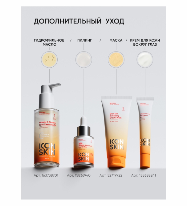 Энзимная очищающая маска-гоммажGlow Skinна основе энзимов тыквы и ананаса – SOS-средство для перезагрузки усталой и тусклой кожи любого типа. Эффект 3-в-1: работает как нежный энзимный пилинг, мягкая очищающая маска и деликатный атравматичный гоммаж. Дарит коже заряд энергии и активирует ее естественное сияние, выравнивает текстуру и тон, обновляет и очищает, придает шелковистость и гладкость. Растительные экстракты насыщают кожу витаминами, возвращают ей тонус и упругость. Микрогранулы воска жожоба сферической формы деликатно полируют поверхность кожи, придавая ей мягкость и шелковистость. Способ применения: