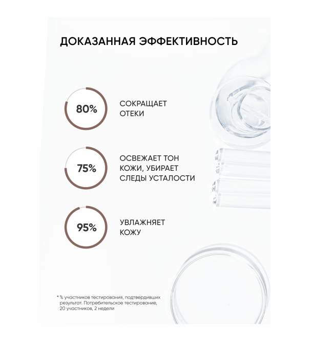 Эффективная формула усилена кофеином и дренажным комплексом в суммарной концентрации 7%. Ее действие направлено на восстановление кожи, в том числе — на нормализацию физиологического баланса влаги. С одной стороны, из кожи выводятся излишки жидкости, приводящие к отекам, с другой — клетки наполняются влагой, необходимой для питания, регенерации и поддержания эластичности кожи. Кроме того, маска способствует укреплению стенок капилляров, усилению микроциркуляции и поддержанию здорового вида и цвета лица.