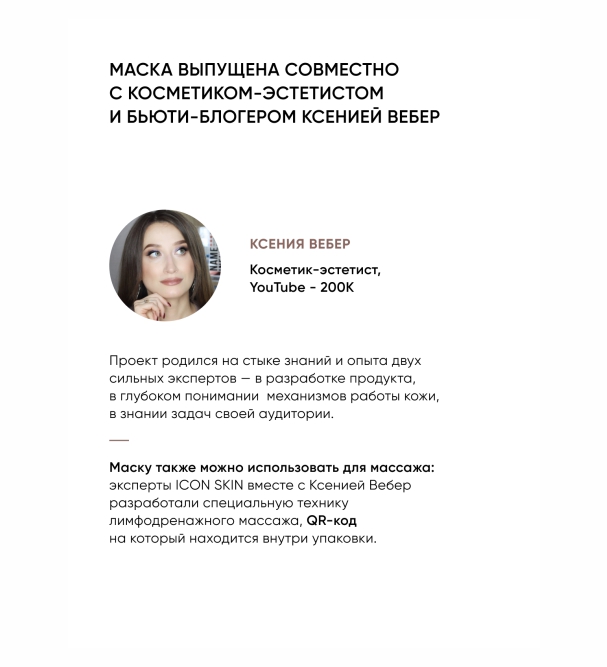 Гелевая текстура равномерно распределяется по поверхности кожи и обладает прекрасной проводимостью, поэтому идеально подходит для микротоковой терапии, повышающей эффективность воздействия. Маску также можно использовать для массажа: эксперты ICON SKIN разработали специальную технику лимфодренажного массажа. Способ применения: