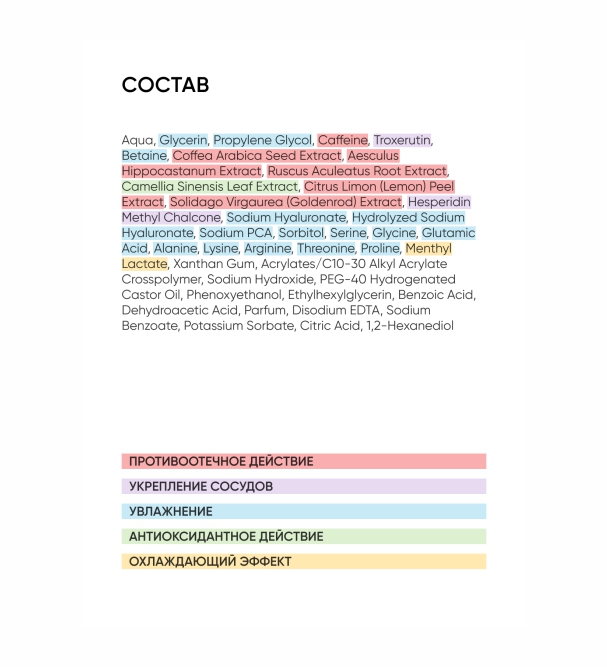 Aqua, Glycerin, Propylene Glycol, Caffeine, Troxerutin, Betaine, Coffea Arabica Seed Extract, Аesculus Hippocastanum Seed Extract, Ruscus Aculeatus Root Extract, Camellia Sinensis Leaf Extract, Citrus Limon (Lemon) Peel Extract, Solidago Virgaurea (Goldenrod) Extract, Hesperidin Methyl Chalcone, Sodium Hyaluronate, Hydrolyzed Sodium Hyaluronate, Sodium PCA, Sorbitol, Serine, Glycine, Glutamic Acid, Alanine, Lysine, Arginine, Threonine, Proline, Menthyl Lactate, Xanthan Gum, Acrylates/C10-30 Alkyl Acrylate Crosspolymer, Sodium Hydroxide, PEG-40 Hydrogenated Castor Oil, Phenoxyethanol, Ethylhexylglycerin, Benzoic Acid, Dehydroacetic Acid, Parfum, Disodium EDTA, Sodium Benzoate, Potassium Sorbate, Citric Acid, 1,2-Hexanediol.