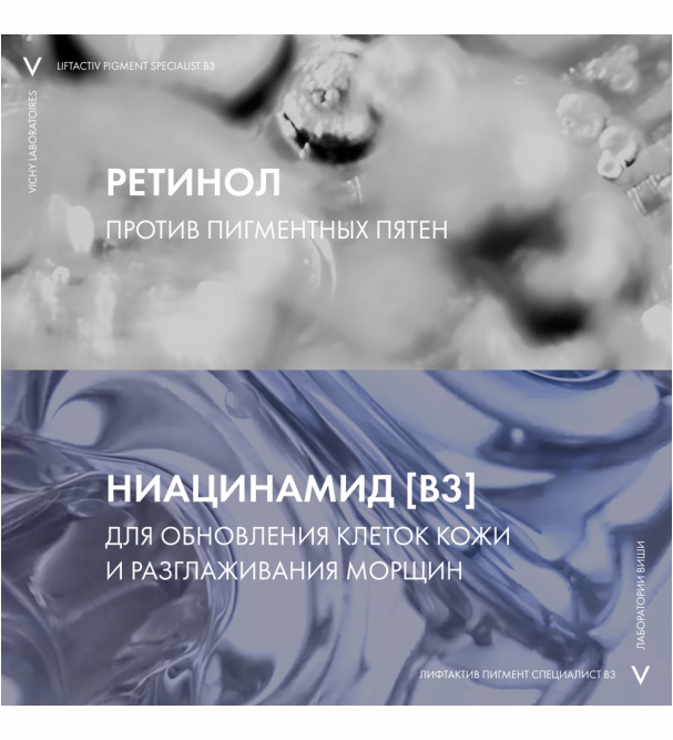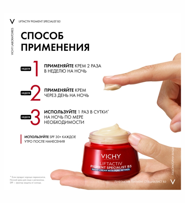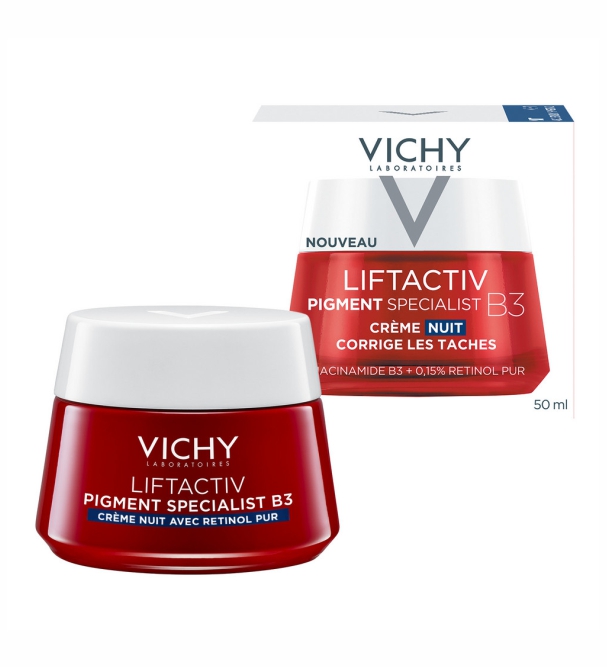 Воздействие ультрафиолета делает пигментные пятна более заметными. Ночь – лучшее время для обновления клеток кожи и сокращения пигментных пятен. Инновация от VICHY: Новый ночной крем с ретинолом эффективно борется с пигментацией и морщинами. Благодаря содержанию мощных активных ингредиентов: чистого ретинола и 4% ниацинамида (витамина B3) – крем ускоряет обновление клеток в ночное время. День за днем пигментные пятна заметно сокращаются, кожа становится более упругой и сияющей, ее тон выравнивается.