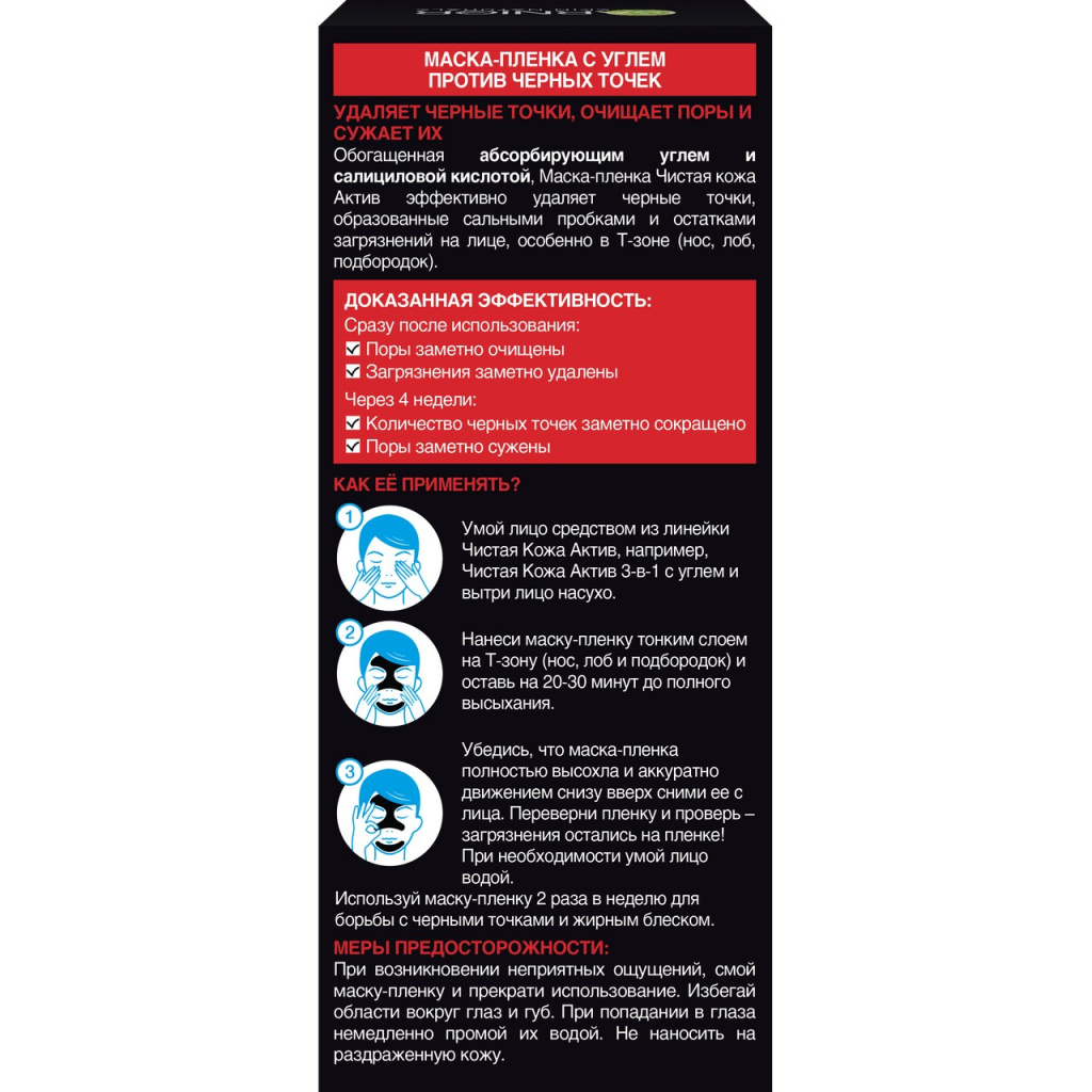 Обогащенная абсорбирующим углем и салициловой кислотой, маска-пленка Чистая Кожа Актив эффективно удаляет черные точки, образованные сальными пробками и остатками загрязнений на лице, особенно в Т-зоне (нос, лоб, подбородок)."
