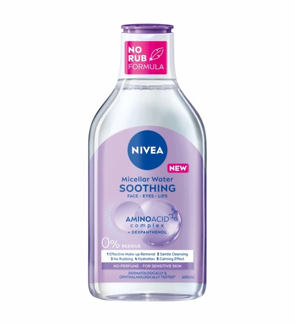 Мицеллярная вода для лица, глаз и губ SOOTHING от NIVEA - успокаивающая формула с комплексом аминокислот и декспантенолом. Не вызывает раздражения – подходит для всех типов кожи, включая очень чувствительную. Снимает макияж без остатка, без трения. Без отдушек. Разразботана специально для чувствительной кожи. 97% ингредиентов натурального происхождения в составе (вкл. воду) и формула не содержит микропластик (согласно определению ЮНЕП). Упаковка на 97% состоит из переработанного пластика (искл. колпачок и этикетку) Применение: Глубоко очищает.