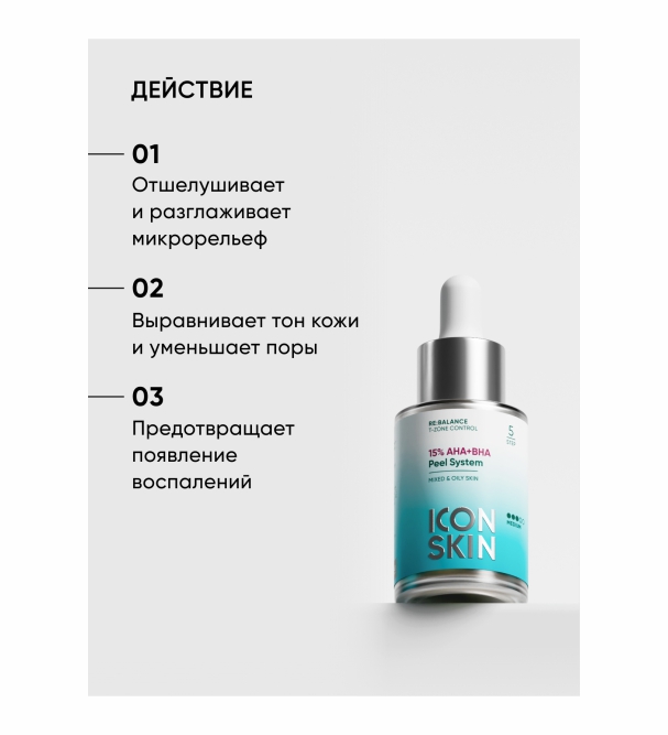 Пилинг можно использовать даже в летний период при условии применения в дневное время средств с SPF 50. ICON SKIN RE:BALANCE – система ухода за комбинированной и жирной кожей, склонной к образованию черных точек и точечных воспалений. Баланс кислот и восстанавливающих компонентов одновременно минимизирует выработку себума и предотвращает обезвоживание Способ применения: